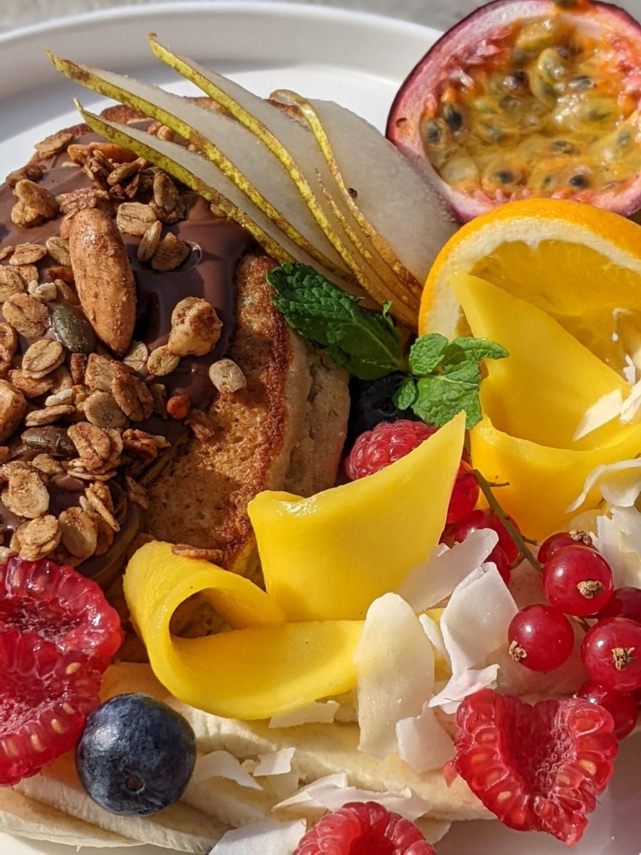 🍳 Au menu, le chef vous propose une formule avec : une boisson chaude, un jus d’orange pressée, croissants et tartines, des pancakes maison aux fruits frais, un granola maison aux fruits servi avec un yaourt grec (ou lait végétal) ou un pudding de graine de chia aux fruits de saison, le tout avec des œufs brouillés ou une omelette. Rien que ça !