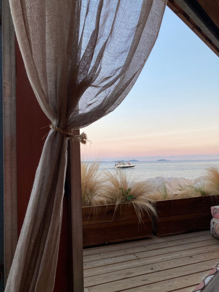 Tout d’abord, laissez-nous vous parler du Mirrey. Au bout du port, à côté de la digue, sur la Corniche Bonaparte, se trouve des containers aménagés. De dos, on pourrait se demander ce que ça peut bien être. Mais, lorsque vous arrivez devant ce lieu, vous êtes tout de suite transporté. Ambiance bois flotté et tissus ethniques, matériaux bruts tels que le bois, la terre cuite et le rotin, musique chill et décontractée, en bord de mer avec une vue sur la baie de Bandol…