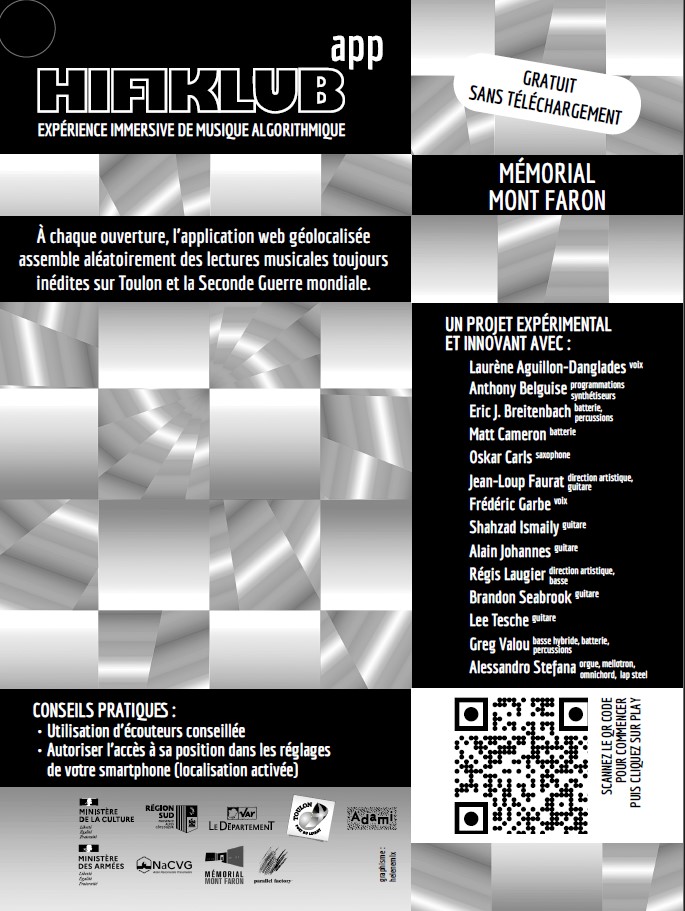 Prolongez l’expérience avec Hifiklub app., une application géolocalisée et immersive : en scannant le QR code à l’entrée, chaque visiteur déclenche une création musicale unique. L’algorithme assemble en temps réel des centaines de séquences pour offrir à chaque écoute une lecture sonore inédite de Toulon et de la Seconde Guerre mondiale.
