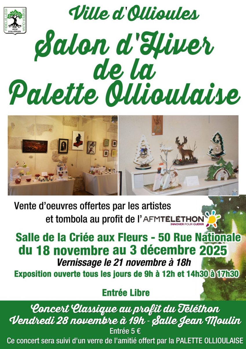 En complément, un concert classique au profit du Téléthon aura lieu le vendredi 28 novembre à 19h, salle Jean Moulin. Entrée : 5 € – Le concert sera suivi d’un verre de l’amitié offert par la Palette Ollioulaise.