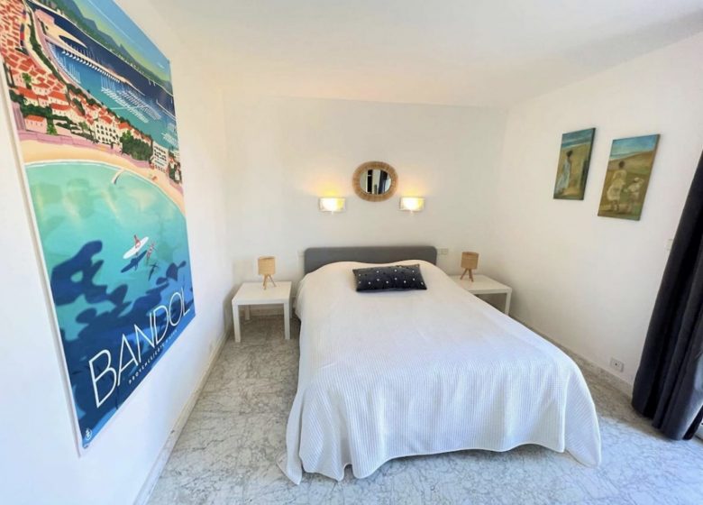 Du côte nuit, nous trouvons une spacieuse chambre parentale plus balcon avec un lit double de 160*200 ainsi qu'une salle d'eau et des WC séparés. Un couloir relie cette partie à la partie jour qui se compose d'un grand salon s'ouvrant sur la terrasse vue mer orienté plein sud - il dispose de deux canapés-lit doubles confortables 160*200 - ainsi que d'une cuisine ouverte avec un petit bar pour les petits repas ou apéros.