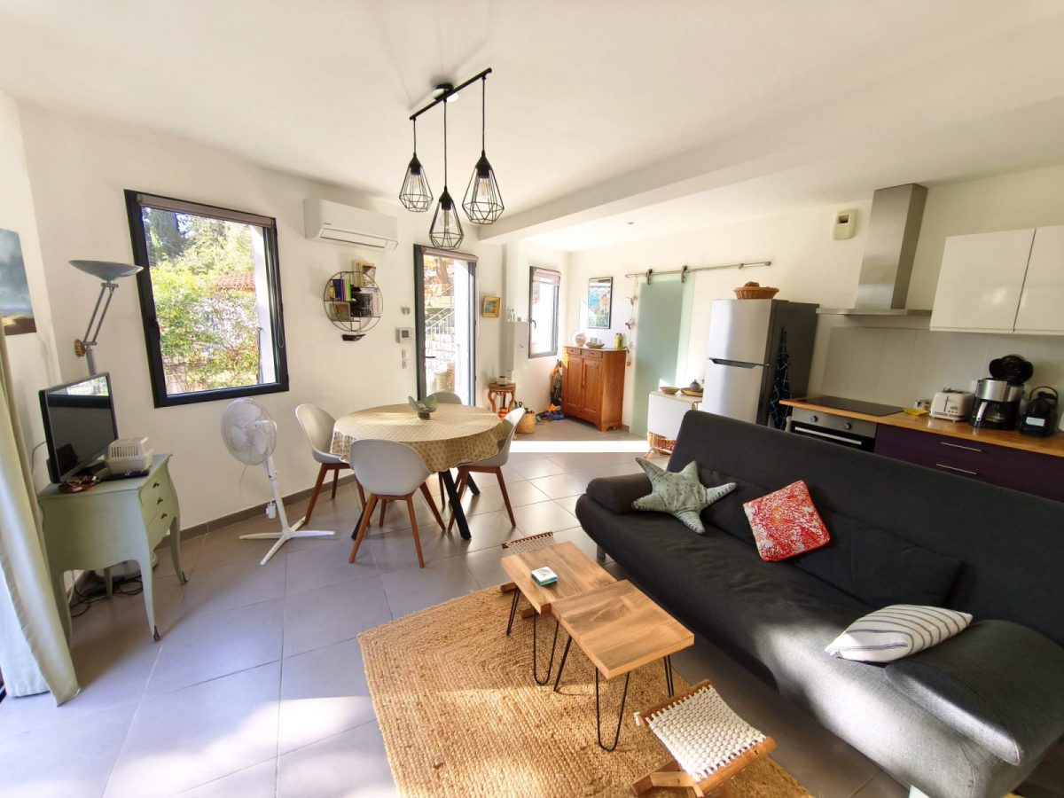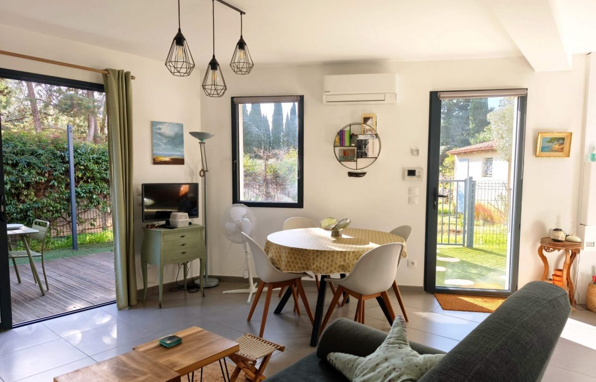 Petite maison mitoyenne pour 4 personnes, dans résidence sécurisée (5 logements), disposant d'une place de parking privée. Environnement calme et arboré, jardinet et petite terrasse ombragée. Plancha électrique à disposition. Au rdc: pièce à vivre d'environ 30m² avec cuisine équipée (plaques induction, four, micro-onde, lave-vaisselle, frigo-congélateur) télévision, wifi, salle de douche avec wc; A l'étage 2 chambres mansardées: 1 avec lit 140 et 1 avec 2 lits 90. Climatisation. Cagibi attenant avec lave-linge. Tout se fait à pied: plage de Renécros à 10min, centre-ville à 15min, parc du Canet et criques à 10min.