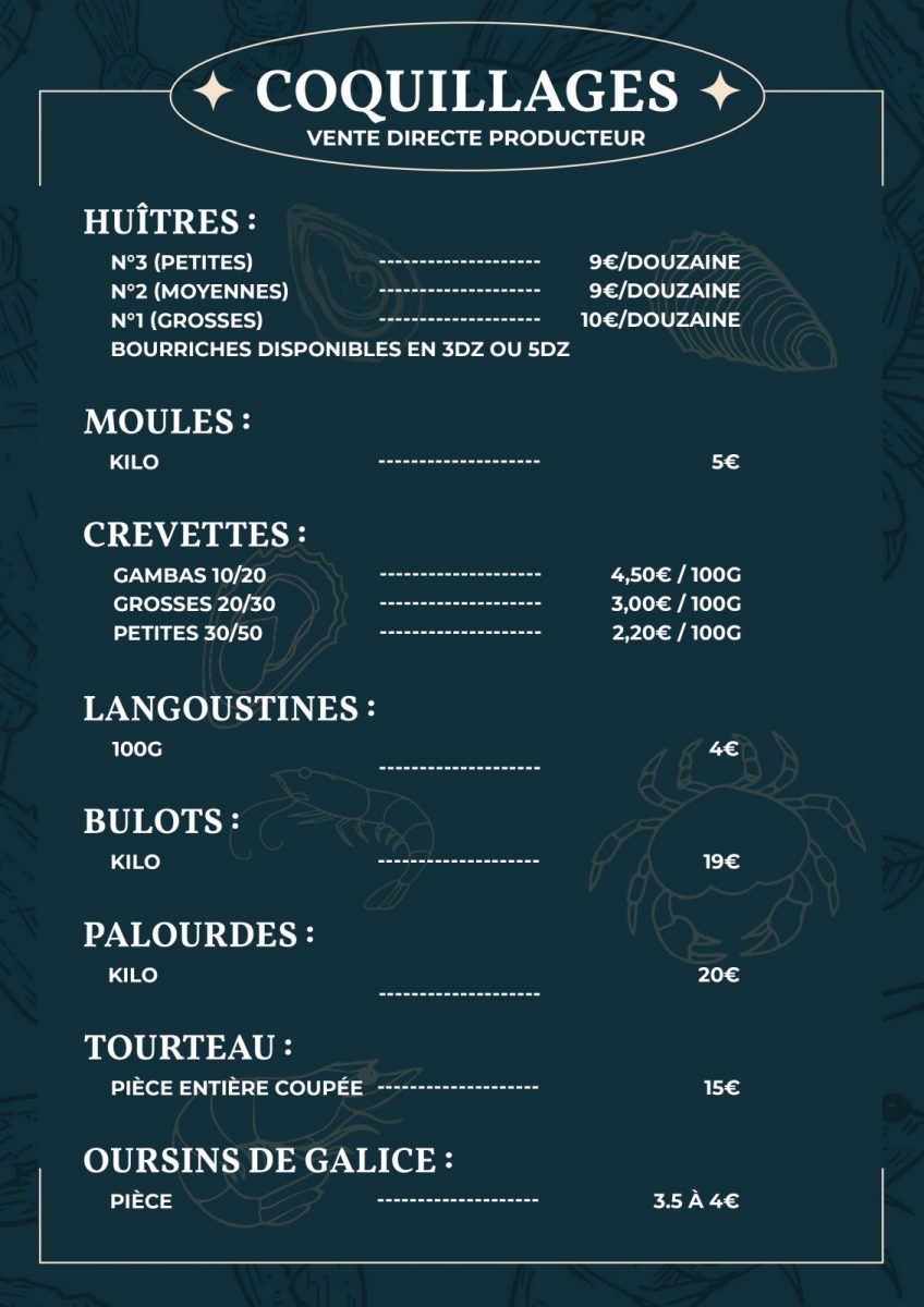 Huîtres, moules, crevettes, langoustines, bulots, palourdes, tourteaux et oursins de Galice.