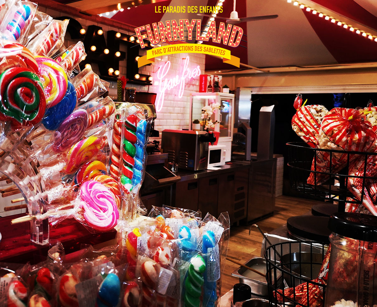 Snack : gaufres, crêpes, churros fait maison, bonbons, glaces, barbe à papa, pomme d'amour toute l'année.