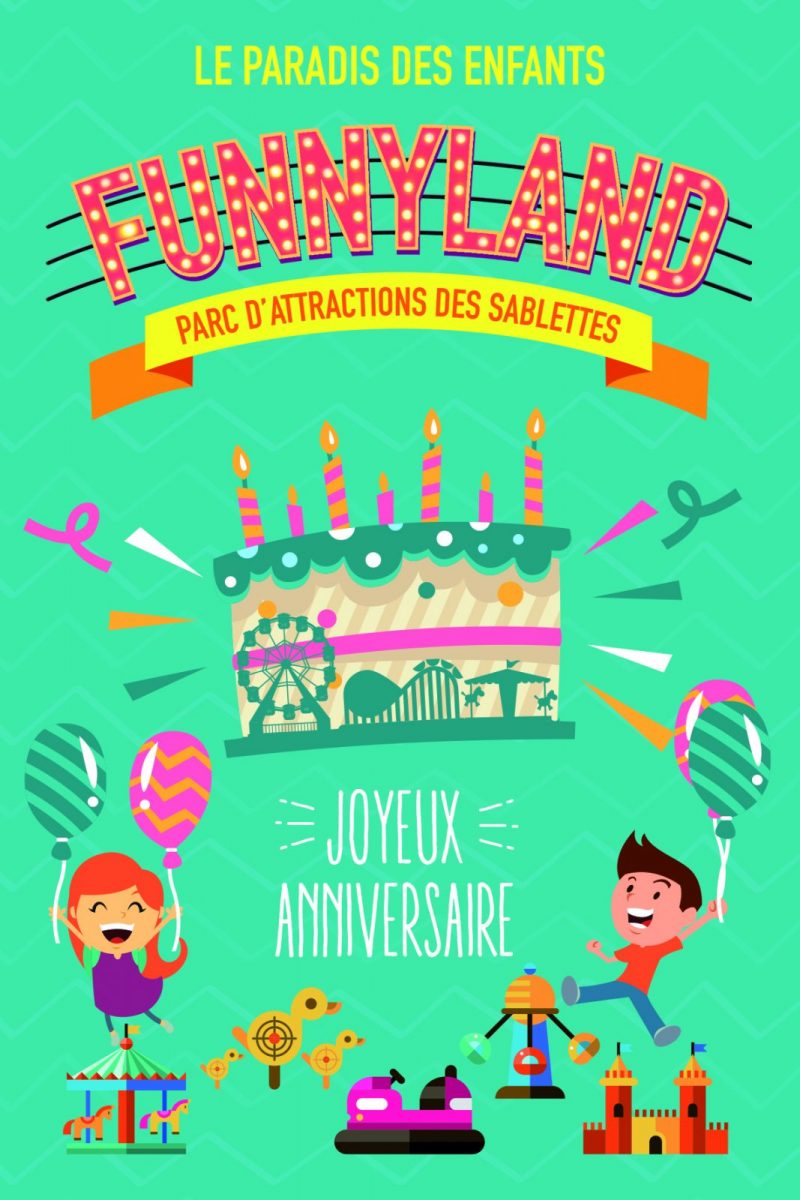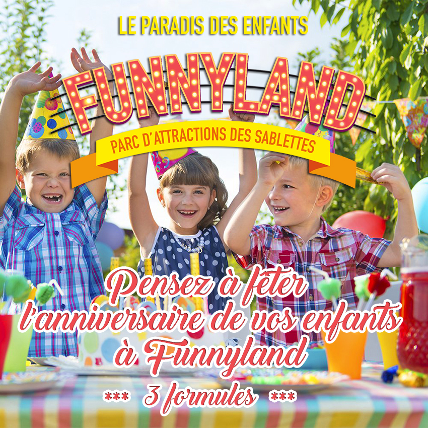 Nous organisons l’anniversaire de vos enfants : tous les manèges à volonté de l’ouverture à la fermeture. Nous vous offrons le gâteau d’anniversaire ainsi qu’une boisson par enfant et d'autres surprises (3 formules possibles - nous consulter sur place ou sur www.funnyland.fr).